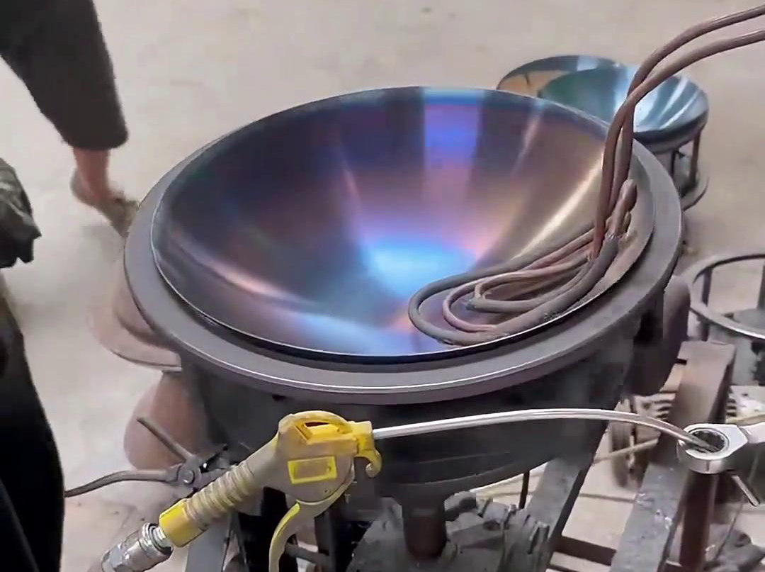 高頻感應(yīng)加熱設(shè)備在鐵鍋烤藍(lán)工藝中的應(yīng)用,是一種高效且環(huán)保的熱處理方法。烤藍(lán)是指在鐵鍋表面形成一層藍(lán)黑色的氧化膜,這層氧化膜可以提高鐵鍋的耐腐蝕性,同時(shí)賦予其獨(dú)特的美觀外觀。傳統(tǒng)的烤藍(lán)方法可能涉及化學(xué)處理或明火加熱,而高頻感應(yīng)加熱則提供了一種更為先進(jìn)和控制精準(zhǔn)的解決方案。